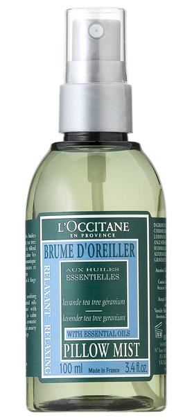 Dans la brume d’oreiller de l’Occitane, il y a les huiles essentielles de lavande, tea tree et géranium. J’en parfume souvent mes draps et l’odeur est vraiment agréable. Je l’adore !