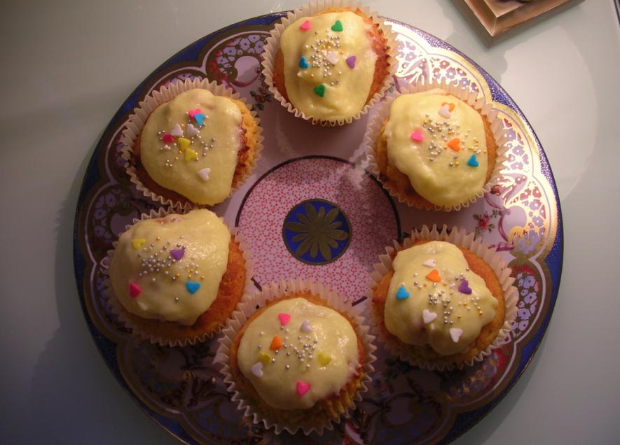6. Pendant ce temps là, préparer votre glaçage. J’ai préparé un glaçage au beurre, à l’orange. J’ai tout simplement pris une noisette de beurre ramolli, j’ai rajouté le jus d’un orange pressé et j’ai tout mélangé avec de la sure glace. Délicieux! Vous pouvez également préparer un glaçage au Philadelphia Cheese, c’est terriblement bon à ce qu’il paraît. Juste un conseil: laisser tiédir vos gâteaux avant de les glacer!