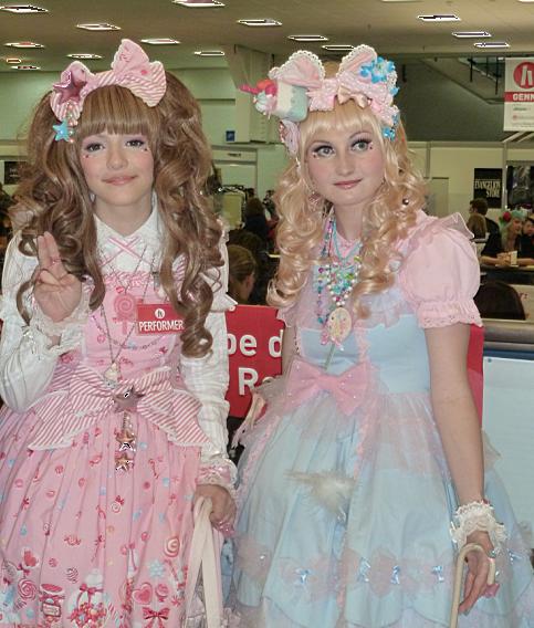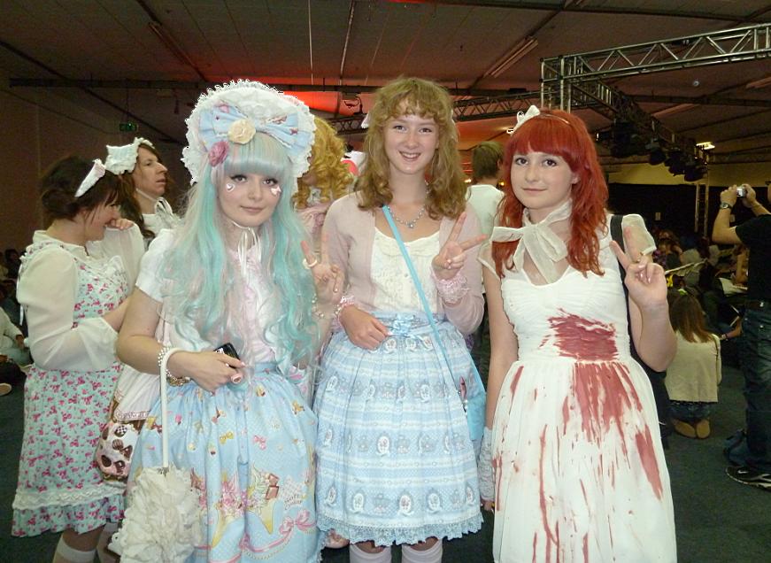 La fille à droite me parle du style « Guro Lolita » (Guro étant dérivé du mot ‘grotesque’), et si j’ai bien compris elle cherchait à casser le style de la princesse trop parfaite évoqué par les Lolitas plus classiques avec ces tâches de faux sang sur sa robe blanche.