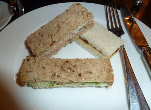 Les sandwiches, scones et autres douceurs arrivent sur un joli stand à gâteaux… Je n’hésite pas à goûter à tous les sandwiches! Nous avons quatre petits sandwiches chacun: œufs – cresson/ concombres / saumon – fromage blanc/ cheddar – chutney.