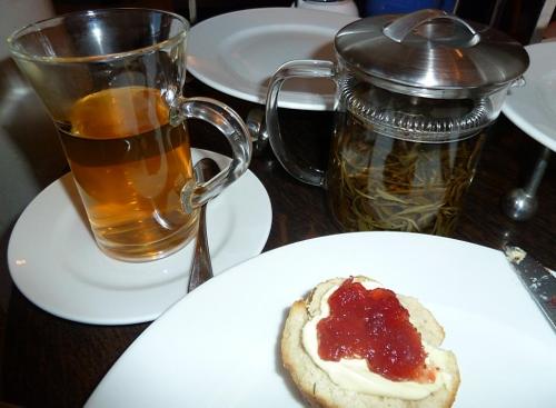 Les scones étaient servis avec de la clotted cream (miam!) et une confiture Preston Hall aux fruits rouges. Ce sont de très bonnes confitures de qualité.
