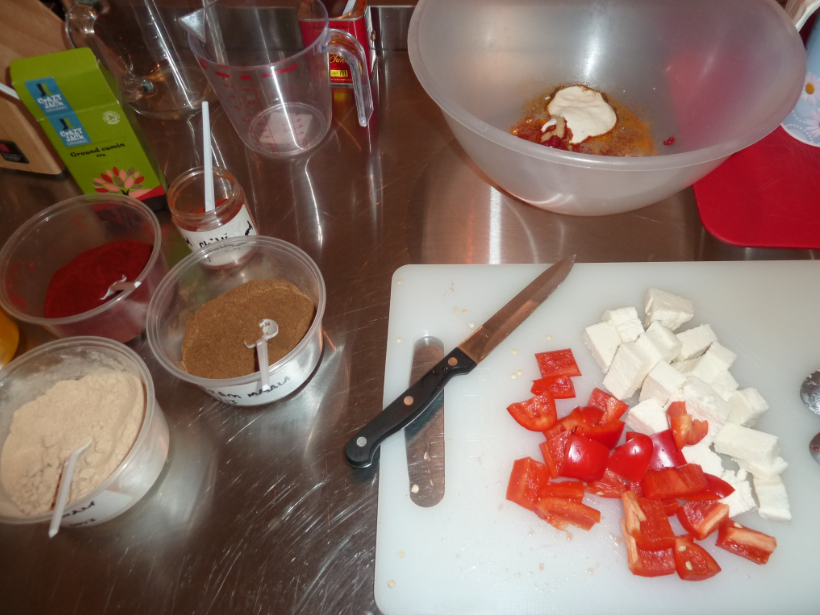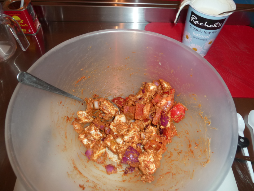 1. Préparation de la marinade: Dans un grand saladier, on verse une cuillère à café de: paprika, d’ail moulu, de poivre, de tumeric, de cumin, de garam masala, avec une demi cuillère à café de piment et de paprika fumé. On y verse une grande cuillère à soupe de yaourt nature puis une cuillère à soupe de purée de gingembre. Nous étions encouragés à sentir les épices, à les apprécier.