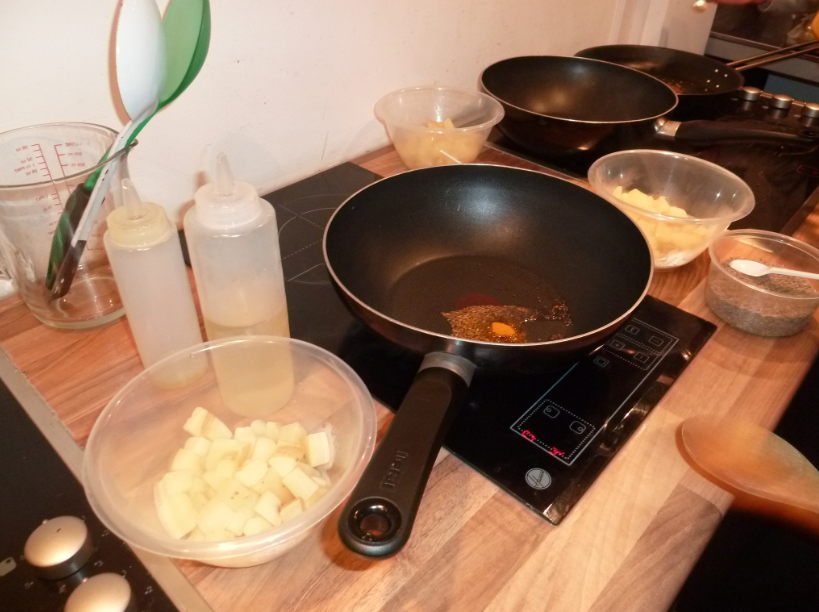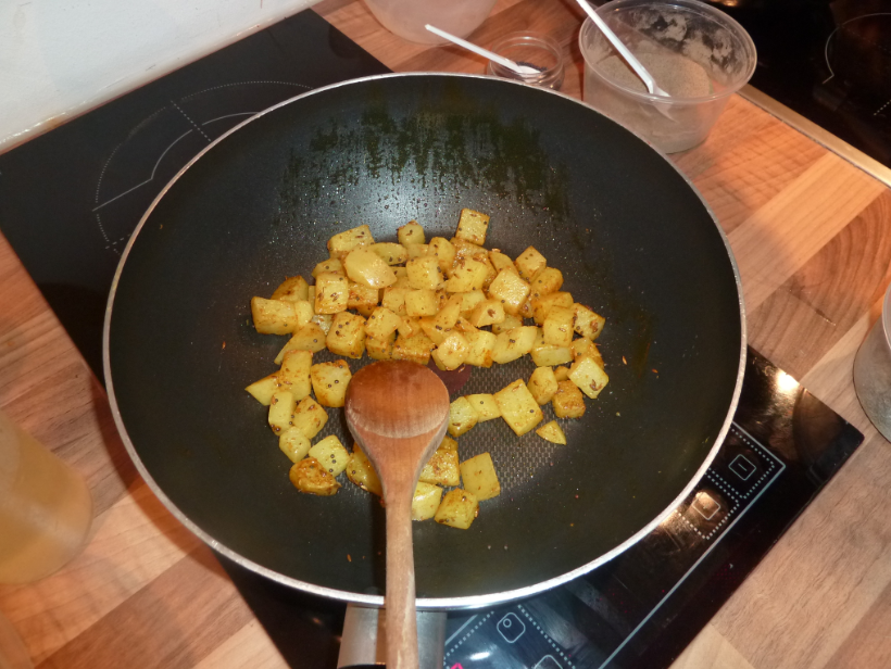 5. Pour les Bombay Potatoes, on fait chauffer une cuillère à café de cumin, une cuillère à café de graines de moutarde et une demi-cuillère à café de Tumeric dans une poêle. On y verse un peu d’huile et on laisse les épices chauffer et infuser. On y verse les pommes de terre et on fait revenir pendant quelques instants. On réserve de côté, une fois prêts.