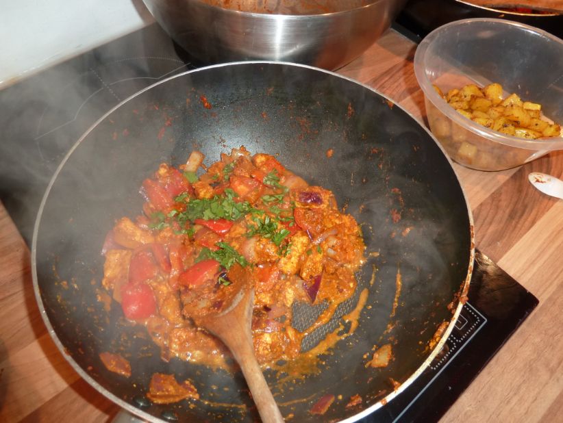 6. On verse le mélange Paneer et légumes dans la poêle avec la marinade. On y rajoute un peu de yaourt nature si besoin, et on y ajoute de la coriandre fraîche. On fait cuire pendant 5 à 10 min, l’odeur est alors vraiment divine!