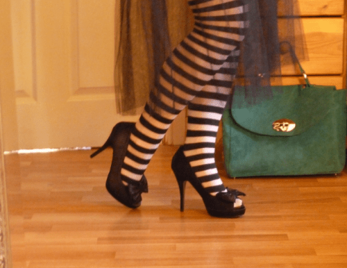 Enfin, ma tenue proprement dite était plutôt simple, je portais un body noir manches 3/4, avec un corset underbust noir de chez Orchard Corset, puis un collant à rayures noires et blanches (ces collants ont aussi une couture rouge à cœurs derrière, pour faire un rappel de couleurs avec le fascinator!). Enfin, je portais également un jupon en tulle esprit années 1950 avec des chaussures Kurt Geiger.