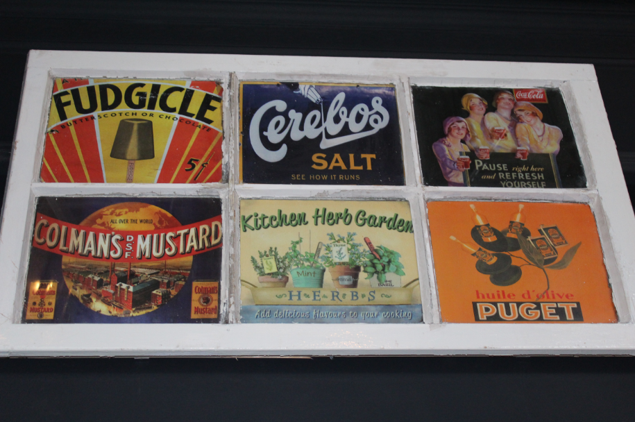 merveilleuse idée de déco, le choisir de vieilles fenêtres pour présenter d’anciennes pub ;
