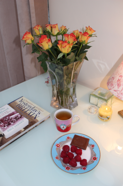 J’ai profité de ce petit moment de détente ce matin pour piocher dans ces deux jolis livres, déguster tranquillement mon thé Marie-Antoinette, et grignoter quelques framboises et un biscuit au chocolat en guise de petit-déjeuner gourmand.