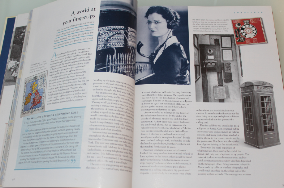 C’est un très beau livre, qui raconte chaque décennie, de 1910 à 1970 en images. Pour chaque période il y a des thèmes différentes, par exemple le petit dossier ci-dessous explique le développement des télécommunications en 1923: