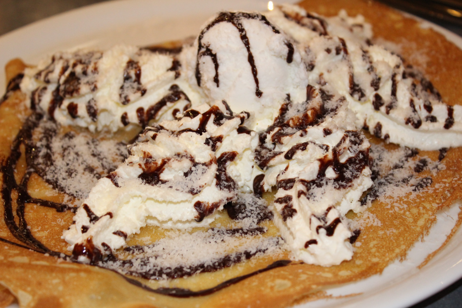 …tandis qu’Aurore a pris une crêpe à la noix de coco, glace, chocolat et chantilly.