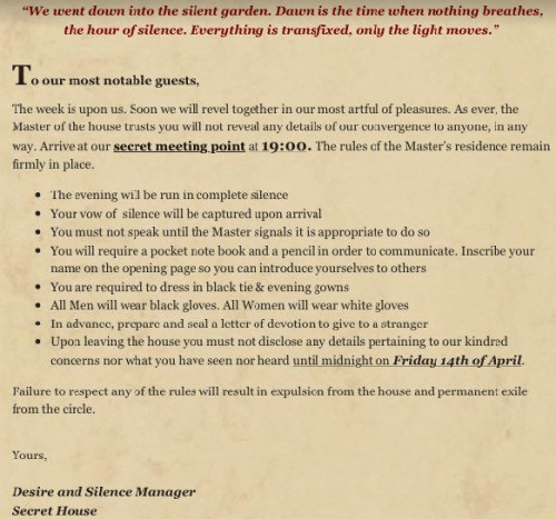J’ai alors découvert qu’il fallait porter une robe de cocktail ainsi que des gants de soirée blancs! Les hommes étaient tenus d’arriver en black tie. Et toujours aucune indice sur le film que nous allons regarder. La soirée se déroule en silence, il faut prendre un carnet avec soi pour communiquer avec les autres.