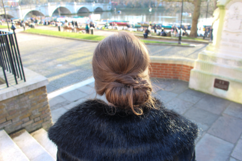 Hier je me suis levée de bonne heure pour me rendre à Richmond. J’avais rendez-vous pour essayer les coiffures de mariage! Pendant plus de quatre heures avons essayé plusieurs coiffures, d’abord les cheveux détachés et ensuite les cheveux attachés. Voici la dernière coiffure, que j’ai gardé pour le reste de la journée.