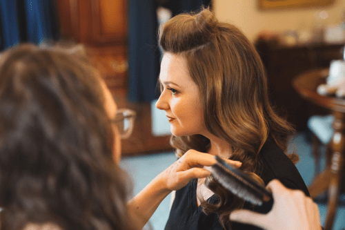 Ma maquilleuse et coiffeuse est arrivée vers 7hrs. Elle a commencé par mes cheveux. J’avais demandé du volume et des boucles façon Hollywood des années 1950. J’ai longuement réfléchi à ma coiffure avant de me décider, et la plupart des personnes me conseillaient d’avoir les cheveux attachés pour que la coiffure puisse durer toute la journée, ce qui était une bonne idée. Voici les photos de moi lorsque j’avais fait un essai de cheveux attachés.