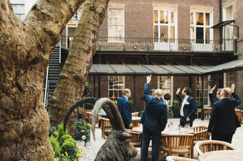 Pendant que les filles se préparaient notre deuxième photographe était avec Fintan, et elle a fait de très jolis portraits de tout le monde dans le St James’ Square. Voici tout le groupe avec nos deux pères, deux frères et le Best Man. Elle a aussi fait de très jolis portraits de nos invités qui commençaient à arriver.