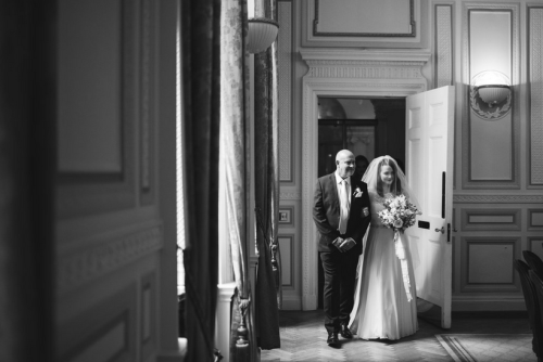 Mon papa est venu me chercher dans la chambre où je me préparais, j’ai pris son bras et nous avons descendu jusqu’à la salle de cérémonie. Après tous ces mois de préparation, toutes ces heures à penser aux moindres détails j’avais du mal à croire que ma journée de mariage était enfin là! J’étais étonnée de voir que je tremblotais un petit peu en rentrant dans la salle de cérémonie.