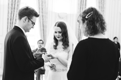 Mes amies m’ont aidé à soulever le voile de mariée. La cérémonie a duré une petite demi-heure, je suis restée debout pendant tout l’échange de vœux. A un moment on a pris le bouquet de mes mains pour le poser sur la table, puis on a dû me le redonner à la fin – c’est drôle, je ne me souviens plus de tous ces petits détails que les photos montrent!