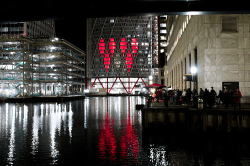 Ci-dessous, vous pouvez voir les « Two Hearts » (« Deux cœurs »), qui battaient ensemble. J’ai beaucoup aimé cette oeuvre, symbole de Canary Wharf, le cœur financier du Royaume-Uni? Ou peut-être une déclaration d’amour à notre ville, ou même un clin d’œil à la St Valentin?