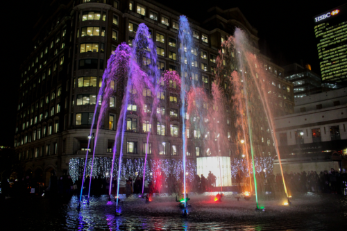 Les fontaines de Canary Wharf se sont bien prêtés au jeu du festival! De jets d’eau colorés dansent au rythme de la musique.