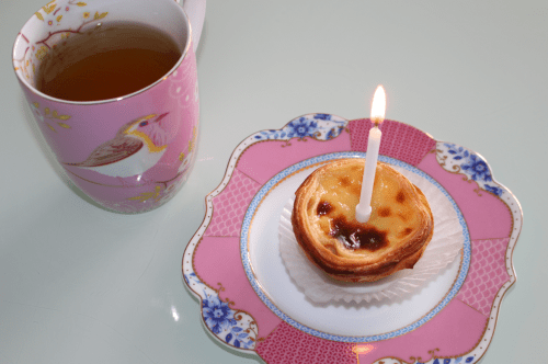 J’ai fêté mon anniversaire de blog de la meilleure façon possible, avec un Pastel de Nata acheté ce matin au marché, une tasse de thé fumante et un joli bouquet de fleurs.