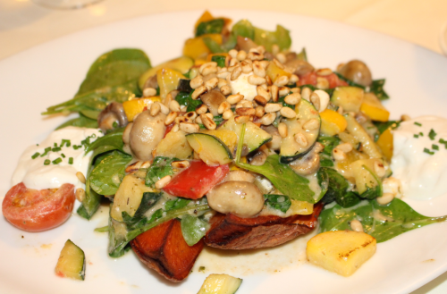 Le restaurant était décoré dans un style traditionnel et tout était très bon! J’ai pris la patate douce rôtie au four servi avec les légumes du chef (courgettes vertes et jaunes, champignons, tomates, épinards et poivrons), des pignons de pin et un peu de crème fraîche à la tomate et à l’ail. C’était original et très, très bon! Je referai bien la recette à la maison.