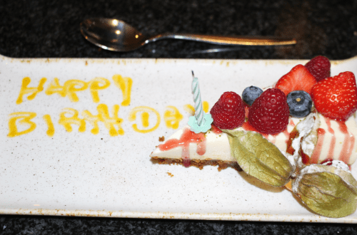 En dessert, j’ai opté pour le cheesecake aux fruits rouges. Tout le personnel a chanté Joyeux Anniversaire ce qui étai très mignon de leur part! Le restaurant nous a aussi offert mon dessert, comme c’était gentil!