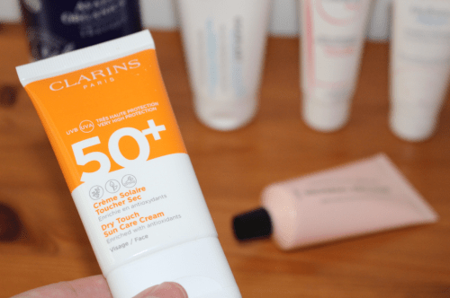 -Le week-end, j’utilise un solaire Clarins en tant que crème du jour. Ma peau tolère bien les crèmes Clarins, qui sentent bons et qui sont efficaces. Je suis contente de cette crème pour le visage, il faut juste faire attention à ne pas appliquer trop de produit sur le contour des yeux sinon le produit peut « glisser » dans les yeux au cours de la journée.