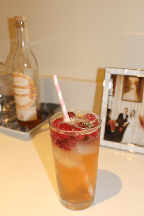 Ici, j’ai utilisé des framboises, mais ce cocktail marche aussi parfaitement avec des pommes ou nectarines coupés en dés, quelques tranches d’orange ou de citron, ou alors avec de la menthe fraîche. On peut aussi préparer une version moins sucrée en utilisant de l’eau gazeuse plutôt que de la limonade, ou alors rendre le cocktail plus fort en y ajoutant un trait de Gin. Que de possibilités!