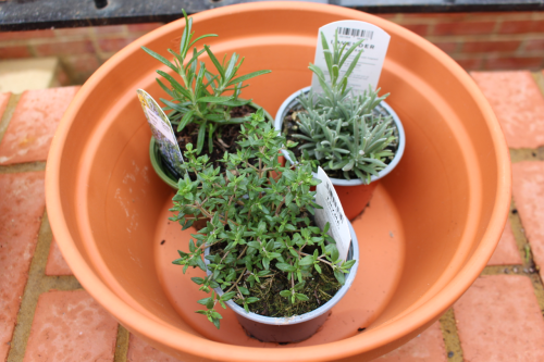 En plus d’avoir des herbes dans la mini serre, j’ai aussi décidé de planter quelques unes dans un deuxième pot en terracotta.