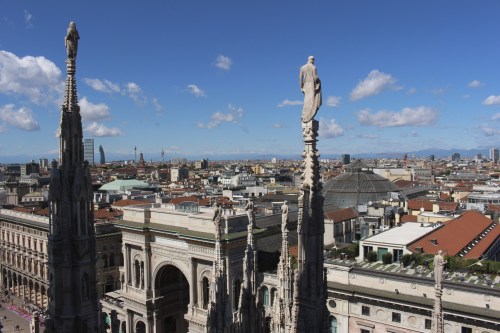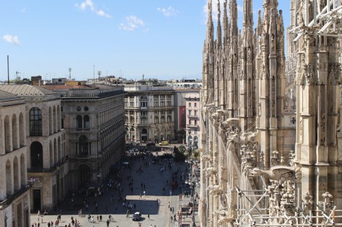 Il faisait chaud à Milan ce jour-là, et il y avait beaucoup de monde. Maman a réservé des billets coupe-fil pour visiter le Duomo, et je recommande vraiment cette option car contrairement à la longue queue que vous pouvez voir ci-dessous, les billets coupe-fil permettent de monter tout de suite au sommet du Duomo, en prenant l’ascenseur. En haut du Dumo, il y a tout un parcours que l’on peut faire, et c’est très impressionnant d’avoir l’occasion de voir l’architecture de plus près.