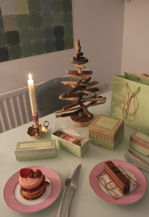 J’espère que vous passez une bonne semaine. Je suis allée travailler au bureau mardi, et j’ai eu l’occasion de passer chez Ladurée en rentant! J’ai craqué pour un petit dessert ainsi que quelques macarons, y compris leur macaron « sapin » parfumé à l’huile essentielle de sapin Nordmann. C’était particulier, mais je suis très contente d’avoir essayé cette nouveauté en cette période de l’avent! J’avais espéré trouver des mini bûches chez Ladurée car j’adore leur bûche Marie-Antoinette, mais comme il était tard il n’y avait plus beaucoup de choix. J’ai tout de même était ravie par mon Ispahan, et Fintan… eh bien il a beaucoup aimé le Plaisir Sucré, mais m’a demandé où était passé l’autre moitié de son gâteau! C’est vrai que la portion était un peu petite…!