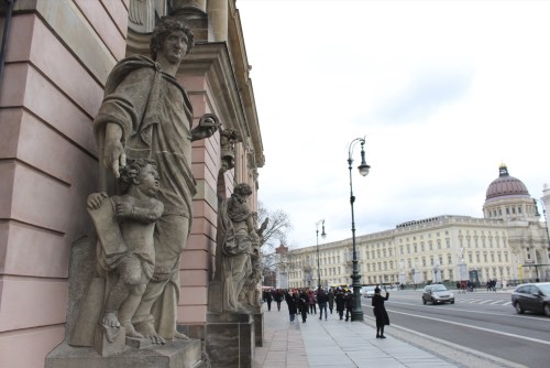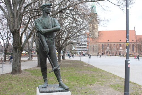 Alexanderplatz a été pratiquement complètement détruit pendant la second guerre mondiale, et a été en parti ré-imaginé sous le régime communiste. On y trouve maintenant des monuments et statues communistes, qui sont absolument immenses et imposants, comme les statues de Marx et Engels ci-dessous. Je ne sais pas si vous pouvez voir sur la photo, mais quelqu’un a ajouté de la peinture rouge sur les mains et aux pieds et Marx, ce qui montre bien ce que cette personne pensait de son idéologie.