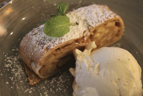 En dessert, j’ai pris le Apfelstrudel – un de leurs desserts végans, servi avec une glace au lait végétal.