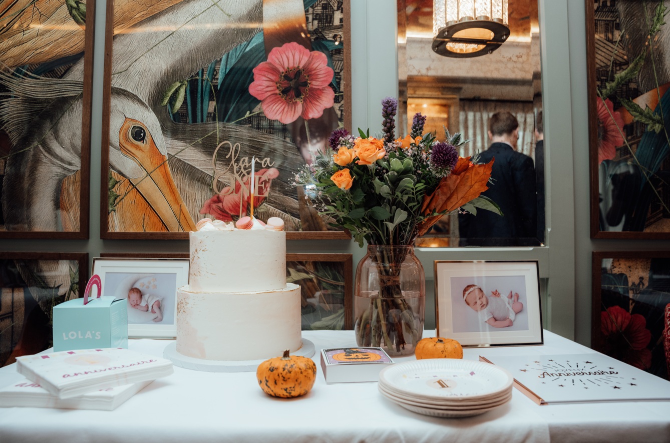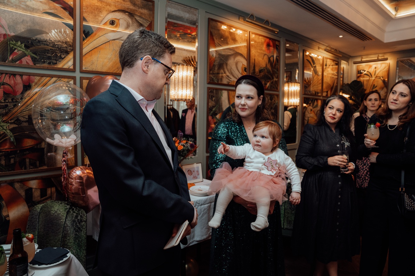 J’avais d’abord eu l’idée d’organiser l’anniversaire de Clara au Lanesborough, mais à vrai dire, au moment où j’organisais la fête je ne savais pas combien de personnes allaient répondre « oui » à mon invitation! Les salles au Lanesborough étaient peut être un peu trop grandes, donc après avoir comparé les différentes options, j’ai finalement réservé une salle au Ivy, j’ai craqué pour leur si joli Pelican Room. Nous étions limités à 30 invités dans cette salle, donc nous avons invité notre famille immédiate uniquement, ainsi que nos amis les plus proches. Nous étions donc en petit comité pour fêter Clara mais c’était juste parfait! J’ai eu le temps de discuter avec tous mes amis qui ont si gentiment pris le temps de venir célébrer l’anniversaire de Clara! J’étais particulièrement touchée que mes amies de France puissent venir, ainsi, elles ont pu rencontrer Clara pour la première fois.