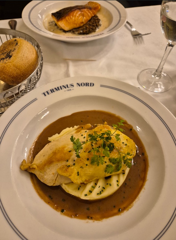 Suivi de poulet grillé, avec une petite purée de pommes de terre ainsi qu’une sauce aux champignons. Pas de dessert puisque nous avons déjà fait le plein de gourmandises chez Angelina!