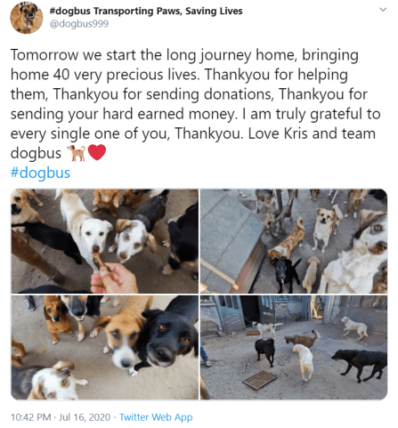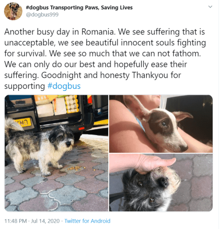 Avril: J’ai découvert une deuxième association, Dogbus, qui aide les chiens battus et abandonnés partout dans le monde mais surtout en Roumanie (décidément!) et qui les ramène en Angleterre pour commencer une nouvelle vie. J’avais fait un premier petit don pour acheter de la nourriture pour chiens, puis un deuxième don pour leur aider à acheter un nouveau bus pour chiens, puisque le leur a été détruit dans un accident de voiture.