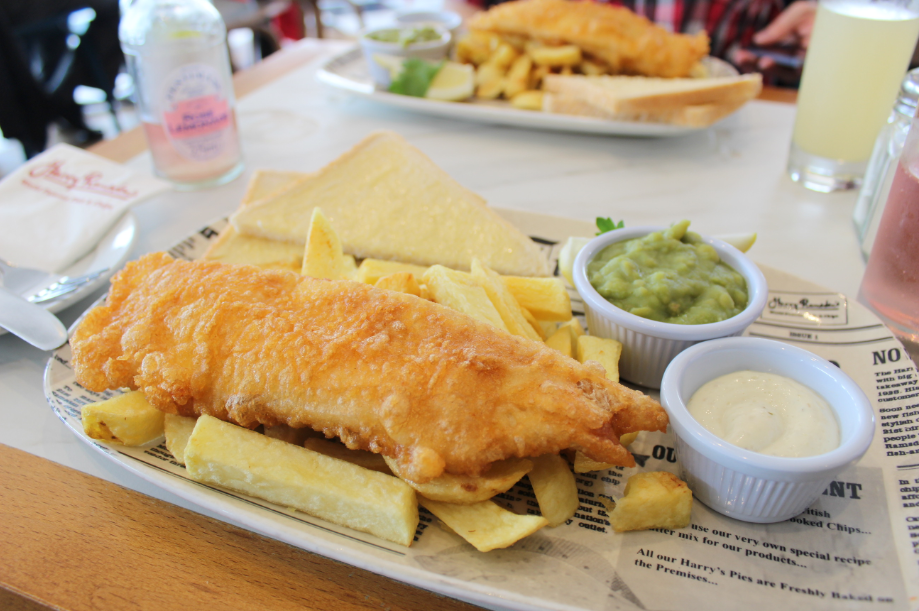Et voilà qui est servi! C’était un délicieux Fish ‘n Chips, très traditionnel avec ses mushy peas (de la purée de petits pois) ainsi que son pain de mie et beurre (Dieu sait pourquoi!). Il faut aller tôt chez Harry Ramsden car ça se remplit très rapidement. Le déjeuner était vraiment très bon, je vous conseille ce café rétro sans hésiter! L’ambiance années 1950 est vraiment trop sympa.