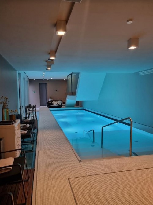 Et leur magnifique Spa! Comme vous pouvez le voir, c’était bien calme, et j’avais la piscine pour moi. Il y avait juste quelques autres femmes au Spa, qui ont préféré passer leur temps au sauna (vu le temps dehors, je les comprends!). Pour ma part je préfère nager et paresser dans l’eau donc j’ai eu la chance d’être seule dans la piscine.