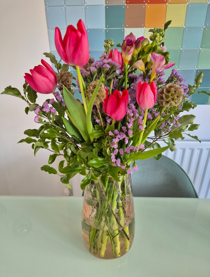 Mon mari m’a offert ce magnifique bouquet! J’aime beaucoup ce bouquet original, ce mélange de fleurs est très réussi.