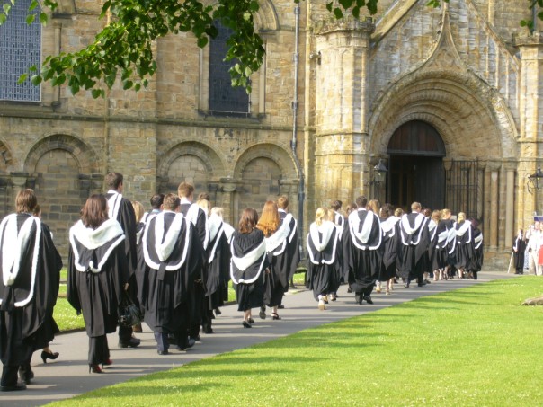 Un petit discours puis on nous place par filière et par ordre alphabétique, ce qui prend pas mal de temps. Une fois placés, on marche du Great Hall jusqu’à la Cour extérieure du Château. Le maître des cérémonies refait un discours, on attend un petit peu, puis à 13hrs45 on commence à marcher du Château jusqu’à la Cathédrale. L’idée est que l’on rentre dans la Cathédrale en étant des graduands, et en ressort diplômés, et on obtient donc le statut des graduates.