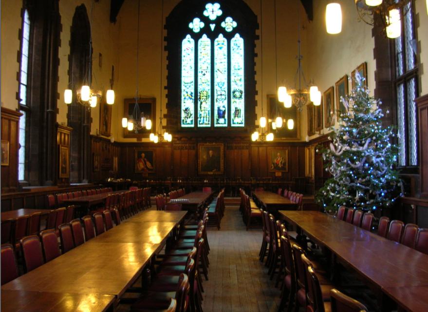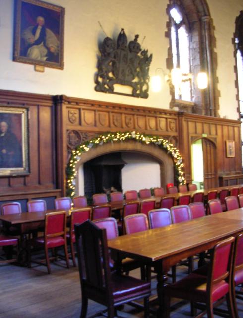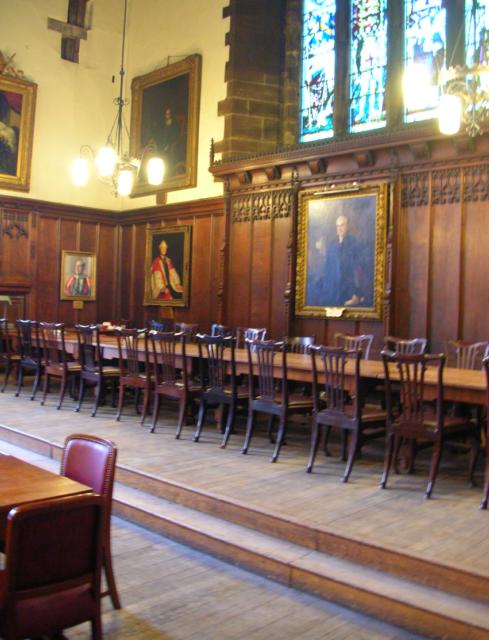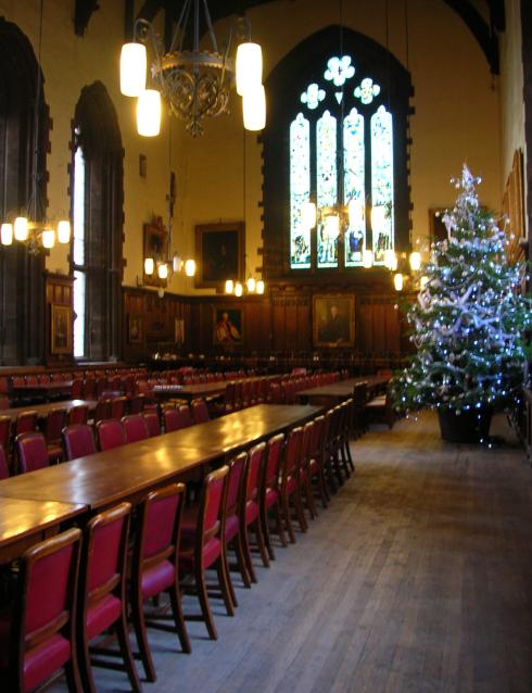 Au premier plan il y a ce que l’on appelle ‘Low Table‘, où les étudiants en licence/maîtrise dînent. Tout au fond, sur une estrade, il y a le ‘High Table’ où les professeurs et où le Master du Château mangent. Les doctorants et étudiants en Master peuvent également manger au High Table sur invitation uniquement.