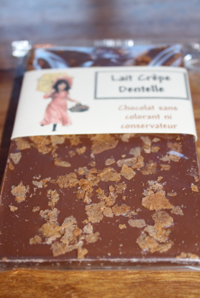 -Une tablette de chocolat au lait, à la crêpe dentelle. Ce chocolat vient d’un petit chocolatier qui s’appelle « La Fondue du Chocolat », et qui se trouve à Pluvigner, également dans le 56.