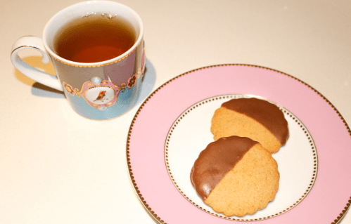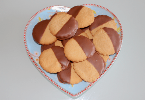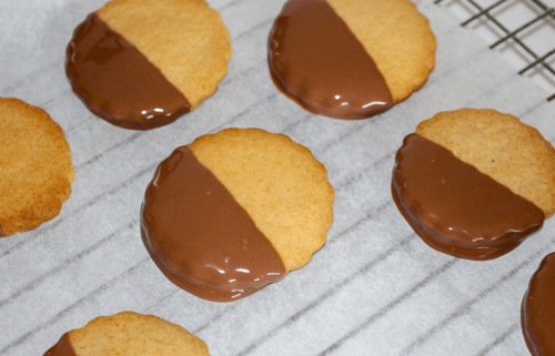 6. Laisser les biscuits refroidir, puis faire fondre le chocolat au bain marie. Tremper les biscuits dans le chocolat puis les laisser refroidir sur une feuille de papier sulfurisé. J’ai également mis les biscuits au frigo pendant une demi heure afin que le chocolat refroidisse complètement.
