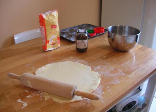 • Découper 12 cercles dans votre pâte et les poser délicatement dans les moules, sans trop appuyer. Découper 12 autres formes de votre choix, afin de pouvoir « fermer » les tourtes.