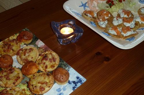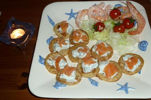 Cette année, en entrée nous avons décidé de picorer des petites bouchées, des blinis au saumon fumé et crevettes: