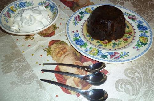 En dessert, un Christmas Pudding, gâteau traditionel, très riche aux fruits secs. Une cuillerée me suffit chaque année!