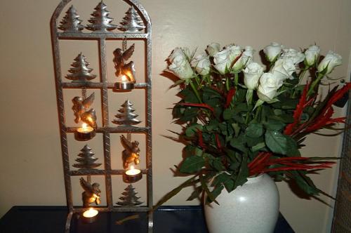 Dans le salon, les anges de Noël scintillent, pendant que les roses blanches brillent de mille feux, grâce à des petites paillettes subtiles, déposées avec soin sur les pétales.