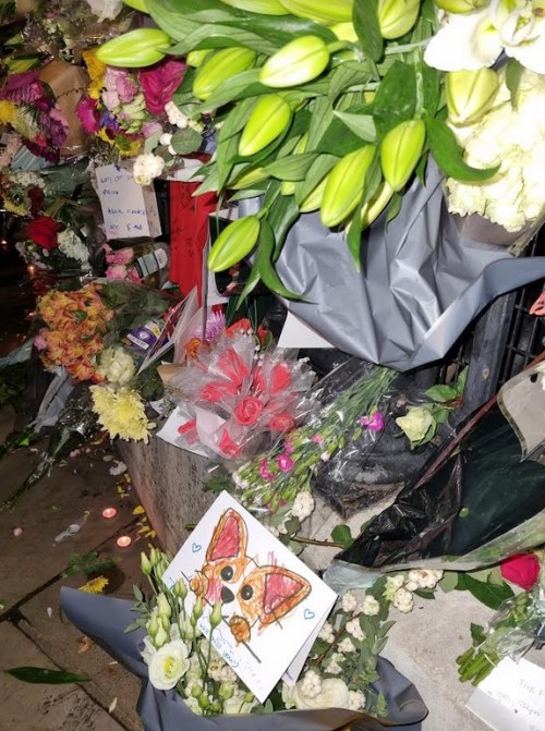 J’ai pris des photos dans la pénombre sans vraiment savoir ce que ça donnait. En rentrant j’ai regardé de plus près les inscriptions capturées. Des deux photos ci-dessous il y a dans la première photo une carte de la part de « Fatima », de la part de « Des gars originaux de l’escadron 205 », de la famille « Smith et Boyed » et dans la deuxième photo un bouquet magnifique et une longue inscription de la part d’une famille qui provient de l’Arabie Saoudite. Ce sont les deux photos des petits mots que j’ai pris, et je pense que ces deux échantillons montrent bien la diversité des personnes qui prennent le temps de laisser une carte et d’apporter des fleurs à Buckingham Palace. La Reine a touché tellement de personnes!