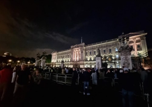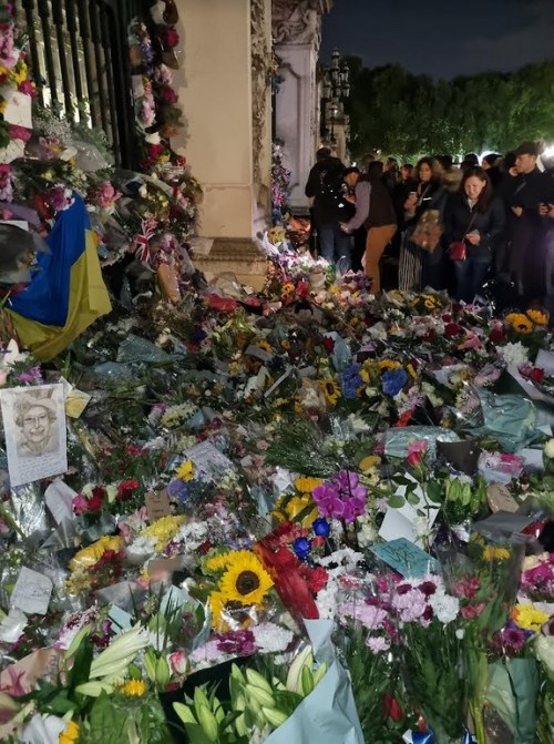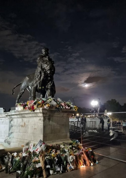 Après le dîner, ma copine et moi avons décidé de nous rendre à Buckingham Palace afin de présenter nos respects à la Reine. Nous avons marché jusqu’au Palais, et le vendredi soir le Mall était encore ouvert, donc nous avons pu marcher dans la rue et nous y rendre directement (beaucoup de rues autour de Buckingham Palace sont maintenant fermées). Nous étions nombreux, mais c’était très silencieux et très respectueux. L’atmosphère était triste mais pas morne, et j’ai ressenti une grande solidarité avec les autres personnes qui étaient là. J’ai vu beaucoup de personnes apporter des fleurs, des peluches, des dessins, des poèmes ou bien des sandwiches à la marmelade, pour rappeler le petit sketch que la Reine a fait avec Paddington Bear pour la Jubilee. Honnêtement j’étais encore sous le choc donc j’ai juste pris quelques photos à la va vite sur mon portable, afin d’essayer de capturer l’ambiance ce ce moment historique.