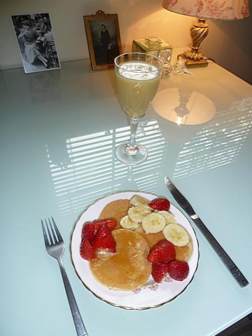 délicieux petit-déjeuner: pancakes au miel avec des fraises et des rondelles de banane, accompagné d’un jus de poire. Un vrai régal!