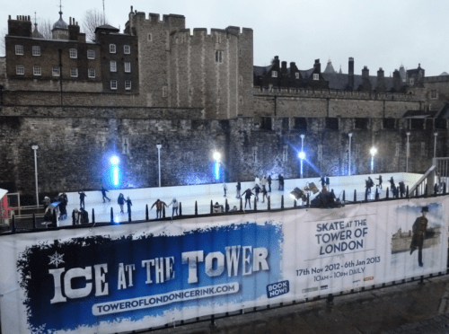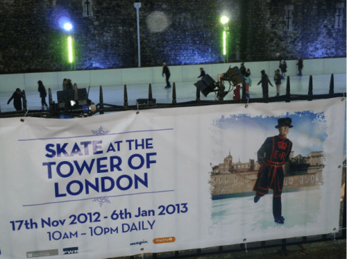 Ice at the Tower of London est ouvert tous les jours jusqu’au 6 janvier, de 10 heurs à 22 heures. Les prix sont vraiment très corrects, £13/h ou £11/hr en fonction de l’heure à laquelle vous souhaitez patiner. A ceci il faut tout de même ajouter £3 de frais d’administration si vous prenez les billets en-ligne et les vestiaires sont à £1 par objet déposé.