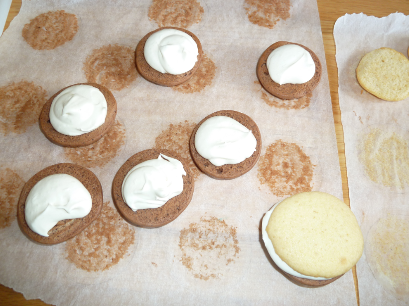 4. Prenez votre poche à douille et remplissez-là de mixture chocolatée. Faire des petit tas de pâte comme ci-dessus. Attention! Ne pas remplir entièrement les cercles de mixture! Non, non, non… Laissez de la marge car les Whoopie vont s’étaler. Faire de même avec la mixture à la vanille et mettre soigneusement au four. Faites cuire pendant 12 à 15 min.
